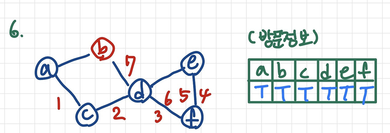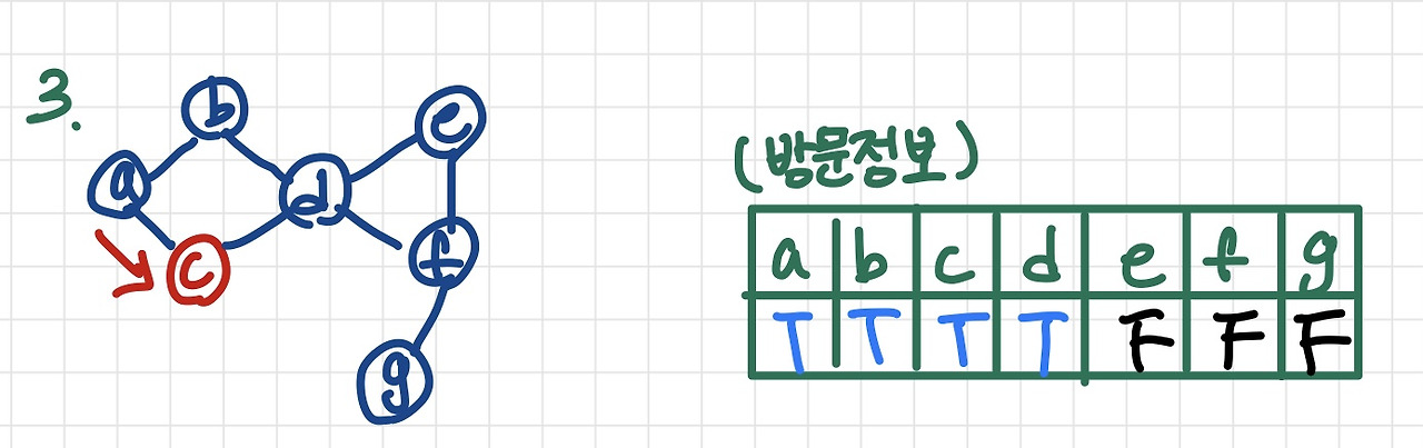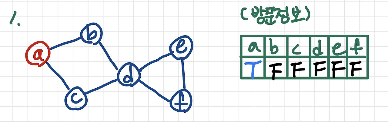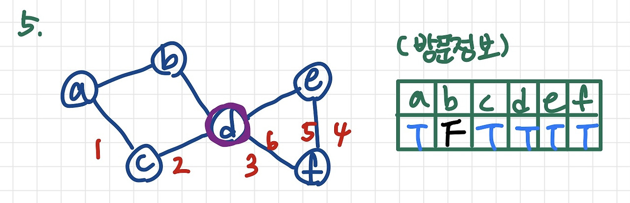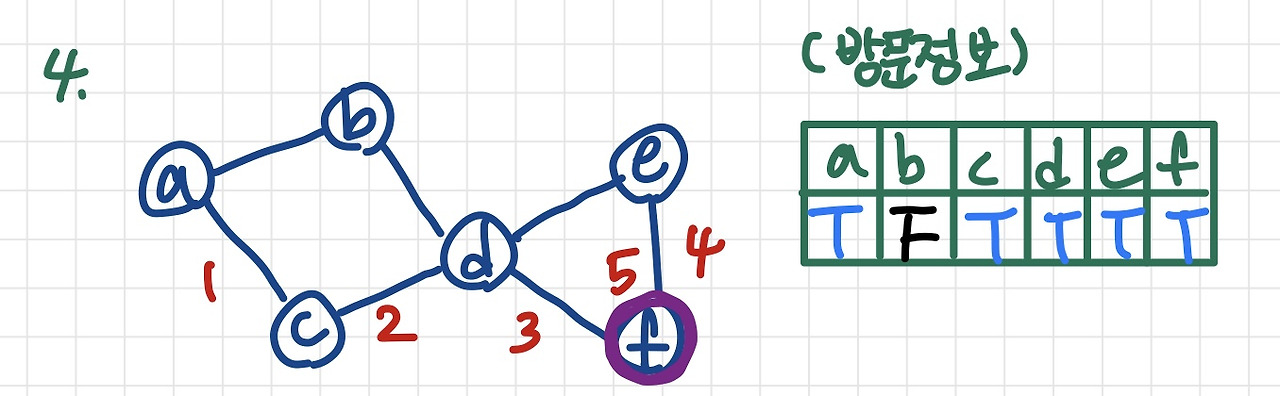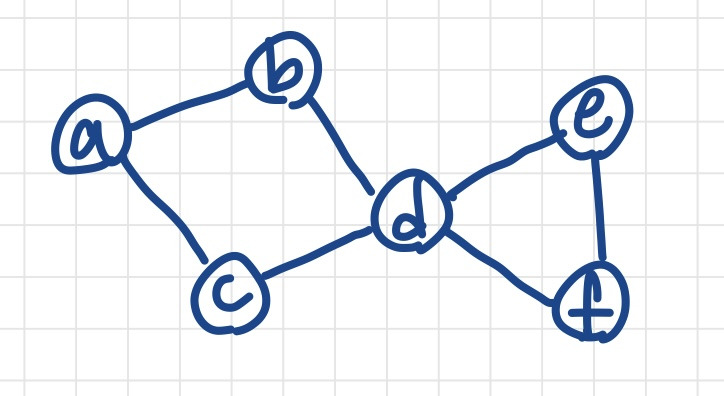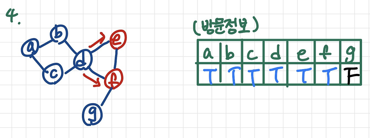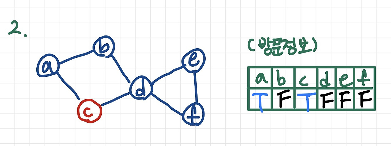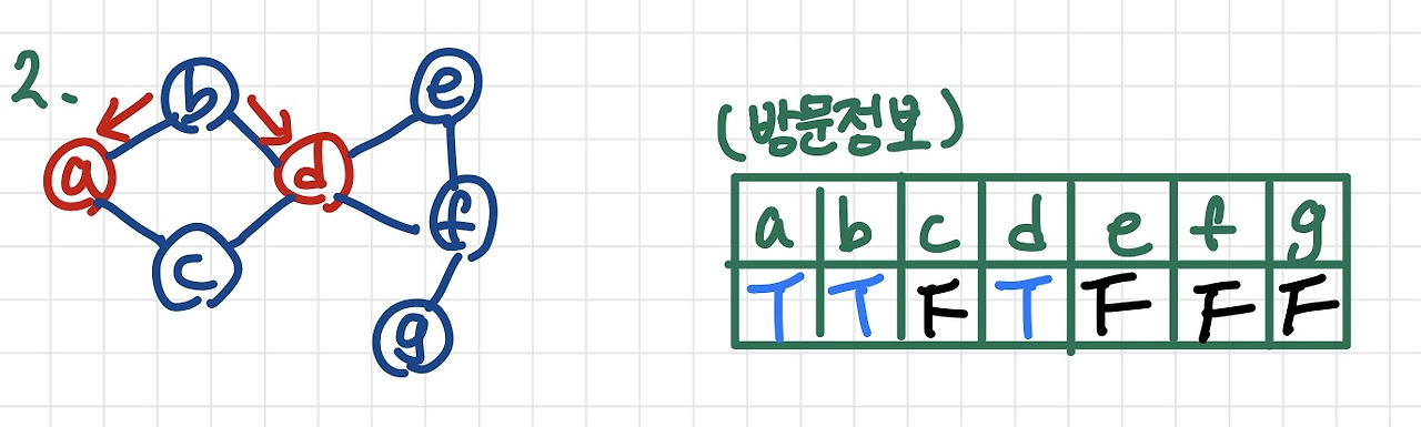 아래 예시로 제시된 그래프를 활용한 탐색 과정은 다음과 같다. (예시) (탐색 과정) -> a부터 탐색 시작 -> a에서 c로 (이때 a의 정보는 스택으로 이동) -> c에서 d로, d에서 f로, f에서 e로 (이때 c,d,f의 정보는 스택으로 이동) -> e에서 f로 (이때 f는 스택에서 pop) -> f에서 d로 (이때 d는 스택에서 pop) -> d에서 b로 (이때 d는 스택으로 push) -> b에서 d로, d에서 c로, c에서 a로(이때 a,c,d는 스택에서 pop)