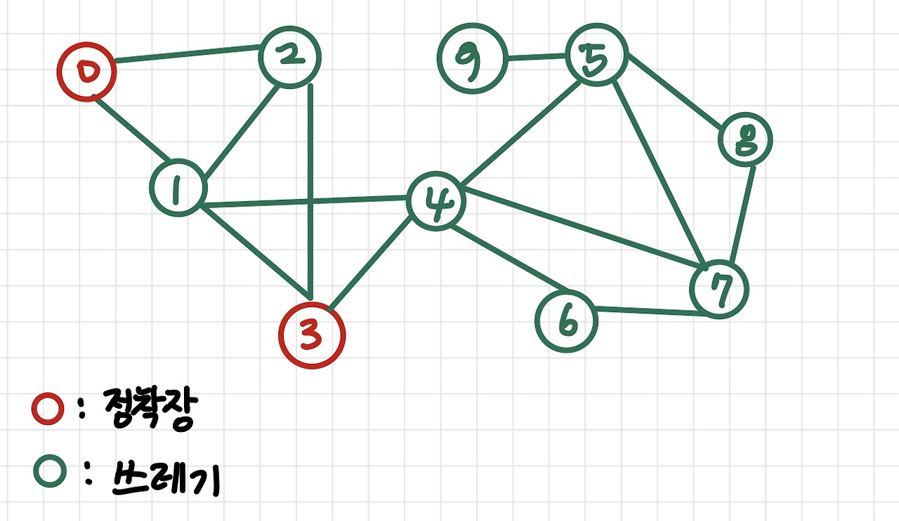 문제2 •수거 로봇을 이용해 쓰레기를 수거합니다. •쓰레기 로봇이 충전할 수 있는 정착장이 2 개 이상 있습니다. •쓰레기와 쓰레기 , 정착장과 쓰레기 거리는 모두 1km 로 동일합니다. •각 쓰레기가 가장 가까운 정착장과 얼마나 떨어져 있는지 구하세요.