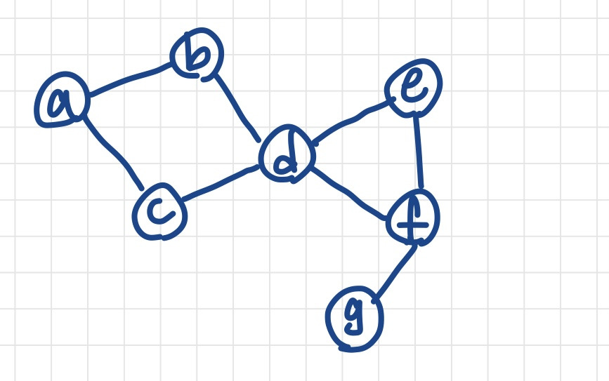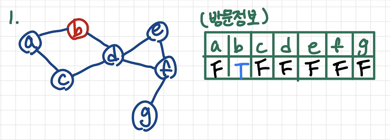 아래 예시로 제시된 그래프를 활용한 탐색 과정은 다음과 같다. (예시) (탐색 과정) -> b부터 탐색 시작 -> d와 a 방문 (이때 d,a는 큐로 enqueue) -> 큐에서 a를 dequeue, a에서 c로(이때 c는 큐로 enqueue) -> 큐에서 d를 dequeue, e와 f 방문(이때 f,e는 큐로 enqueue) -> 큐가 완전히 빌 때까지 큐에서 dequeue해서 방문하고 enqueue하는 과정을 반복 -> 마지막으로 g도 스택으로 enqueue된 후 dequeue되면서 종료