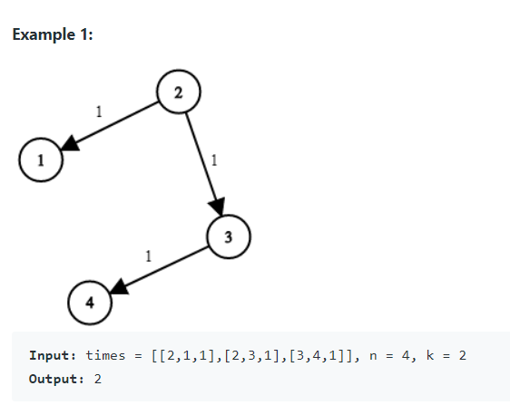 문제 n개의 노드로 구성된 네트워크에 1부터 n까지 레이블이 지정됩니다. 또한 지시된 에지 시간 [i] = (ui, vi, wi)와 같은 이동 시간 목록이 제공됩니다. 여기서 ui는 소스 노드, vi는 대상 노드, wi는 신호가 소스에서 대상으로 이동하는 데 걸리는 시간입니다. 우리는 주어진 노드 k에서 신호를 보낼 것이다. n개의 모든 노드가 신호를 수신하는 데 걸리는 최소 시간을 반환합니다. n개의 노드가 모두 신호를 수신할 수 없는 경우 -1을 반환합니다.
