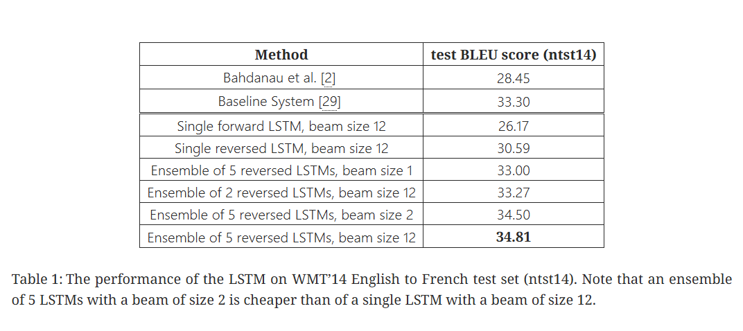 - BLEU 점수: 단일 LSTM보다 역순 처리된 LSTM이 더 높은 성능, 최종 BLEU 점수 34.81로 최고 성능.