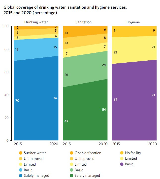 기본적인 위생조차 없는 사람들 중 약 500만명은 여전히 개방 배변을 하고 있다. 식수를 안전하게 관리하려면 현재 진행되는 위생 서비스의 속도를 4배 정도 향상시켜야한다. 물 위생 서비스에 대한 보편적인 접근은 가정에서의 사용을 훨씬 뛰어넘는다. 이를 통해 2020년에 약 800만명의 어린이들은 기본적인 손씻기 시설과 같은 위생시설이 부족한 학교를 다녀야 했다는 것을 알 수 있다.