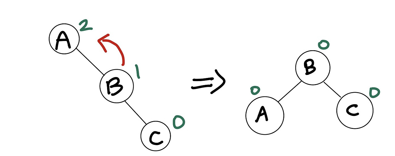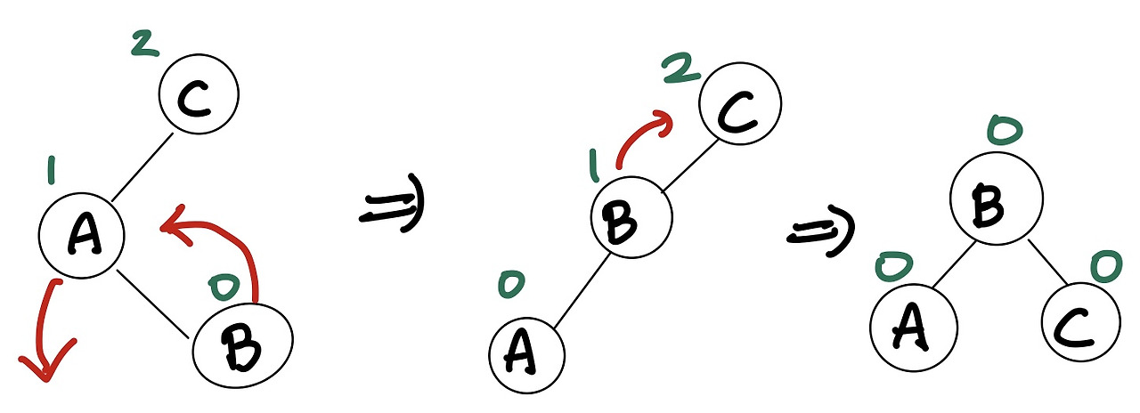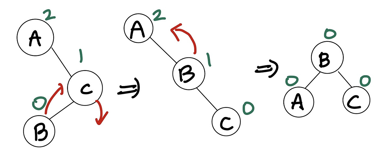 Deletion -단계 1) 일반 이진 탐색 트리 삭제를 수행한다. 2) 현재 노드는 삭제된 노드의 상위 노드 중 하나여야 하므로 현재 노드의 높이를 업데이트한다. 3) 현재 노드의 Balance Factor를 가져온다. 4) 균형 계수가 1보다 크면 현재 노드가 불균형 상태이고 LL이나 LR 상태인 것이다. 이를 확인하기 위해 왼쪽 하위 트리의 Balance Factor를 가져온다. 왼쪽 하위 트리의 Balance Factor가 0보다 크거나 같으면 LL이고, 그렇지 않으면 LR이다. 5) 균형 계수가 -1보다 작으면 현재 노드가 불균형 상태이고 RR이나 RL 상태인 것이다. 이를 확인하기 위해 오른쪽 하위 트리의 Balance Factor를 가져온다. 오른쪽 하위 트리의 균형 계수가 0보다 작거나 같으면 RR이고, 그렇지 않으면 RL이다.